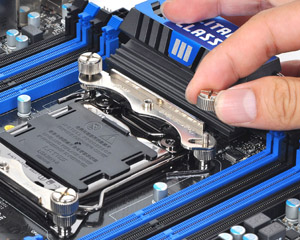 | Screw the heat-sink onto the motherboard with the mounting plate tightly. | Fix the two fans onto the heat-sink with fan clips separately. |