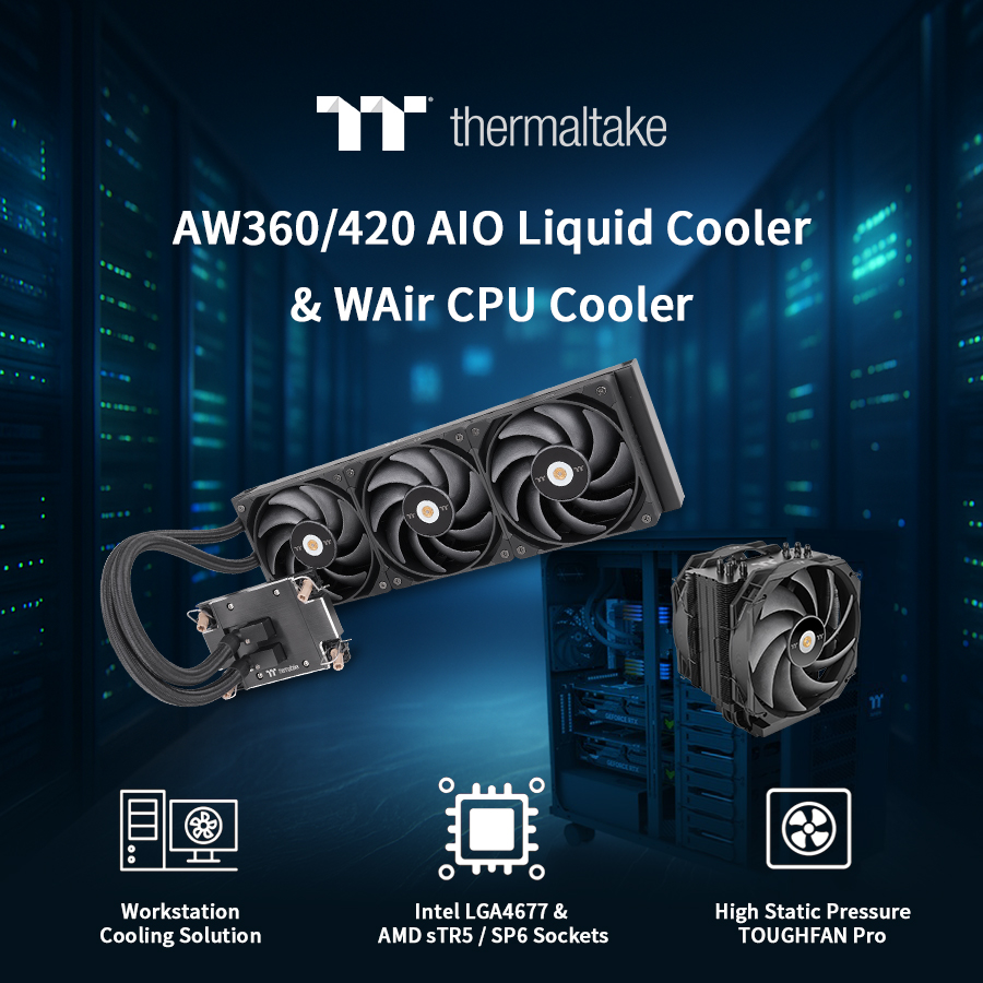 Taipei, Taiwan-October 8th, 2025-Thermaltake, a leading PC DIY brand for premium hardware solutions, proudly announces the availability of the AW360/420 AIO Liquid Coolers and the WAir CPU Cooler, two high-performance cooling solutions designed specifically for modern workstations. Built for professionals tackling demanding workloads such as 3D rendering, AI computing, CAD design, and big data analytics, these coolers are engineered to deliver exceptional thermal performance, stability, and low noise under continuous high-load conditions.